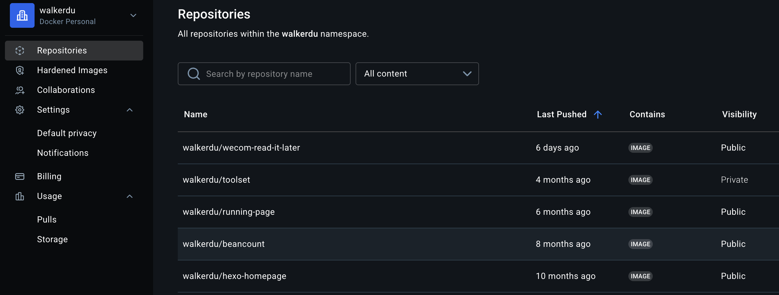如下是Docker Hub我的Image仓库列表: