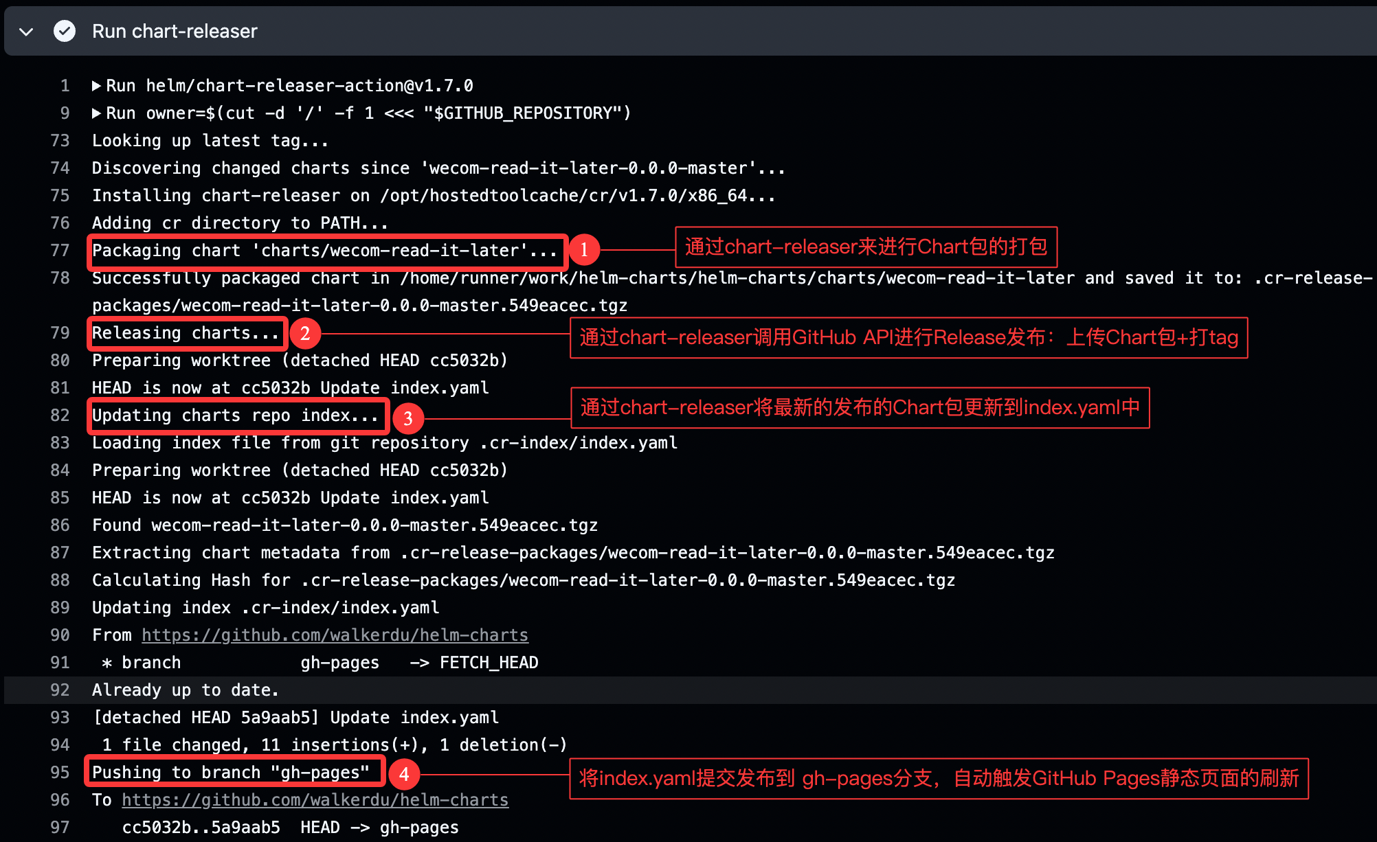 这里需要配置一个GITHUB的PAT,用于Chart Releaser Action通过GitHub API来操作当前的helm-charts。默认我们提交主分支的charts目录包,就会自动触发Action,然后进行Chart的发布,Chart Releaser Action会调用Chart Releaser工具进行Chart包的上传和index.yaml文件的发布: