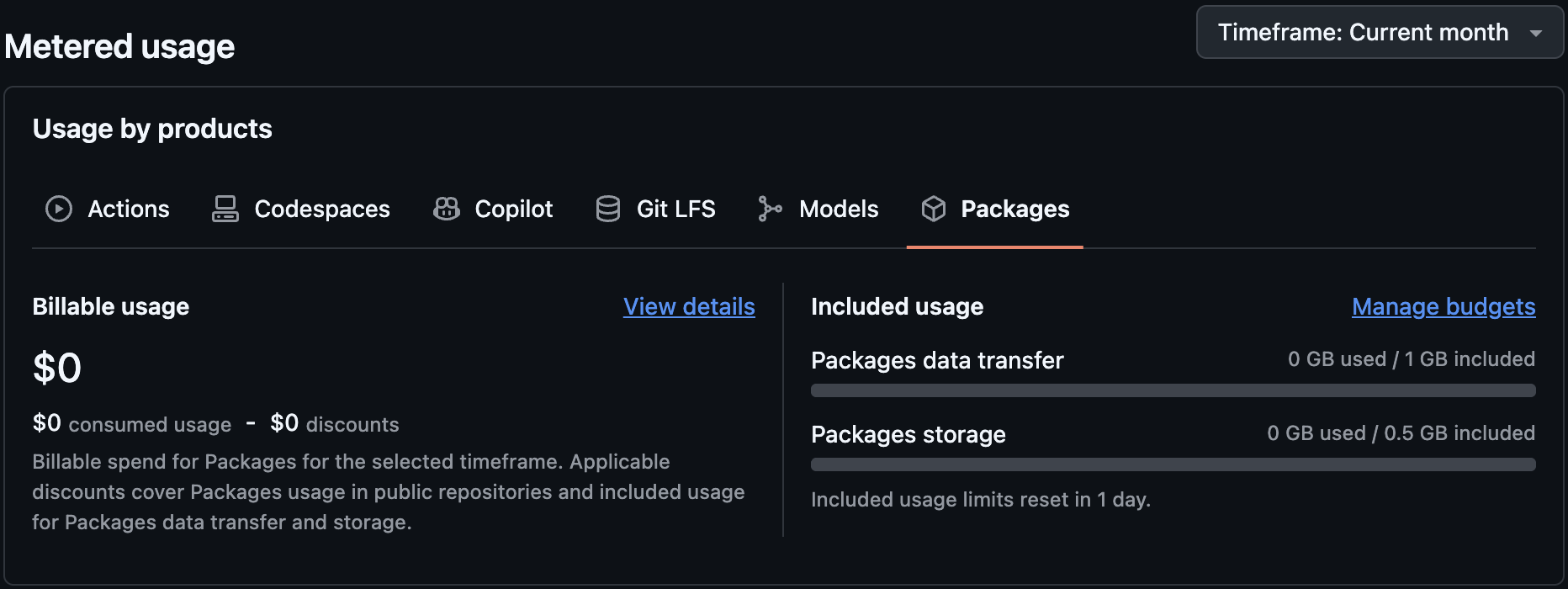 GHCR 的存储和数据传输(下载/拉取)计入 GitHub Packages 的整体配额。公共镜像(public repositories)免费且无配额限制;私有镜像(private)有免费额度,超出后需付费或被阻塞(如果无有效支付方式)。配额因计划而异(免费、Pro、Team、Enterprise),具体见 About billing for GitHub Packages。像我是GitHub Free(大部分都是)用户,Private Image的额度就是500MB的存储和1GB的传输量。