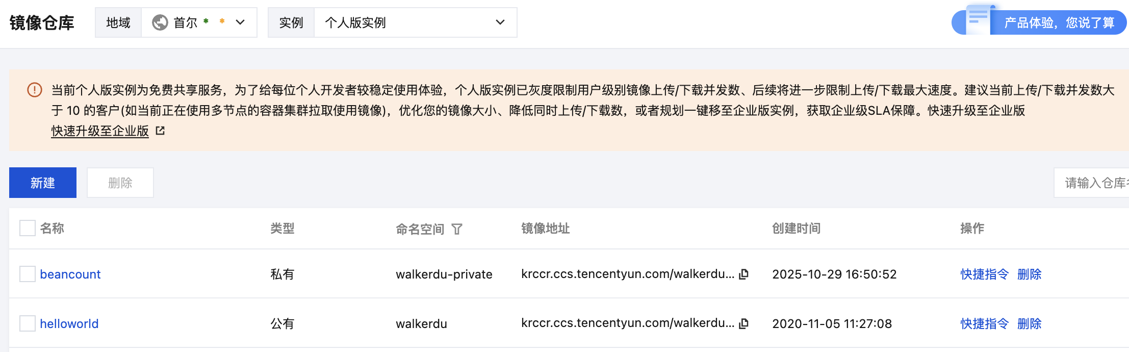 | Tencent Image Registry | 个人版本,单镜像下镜像版本最多100个 | 和公有限制一样 | ⭐⭐⭐ |