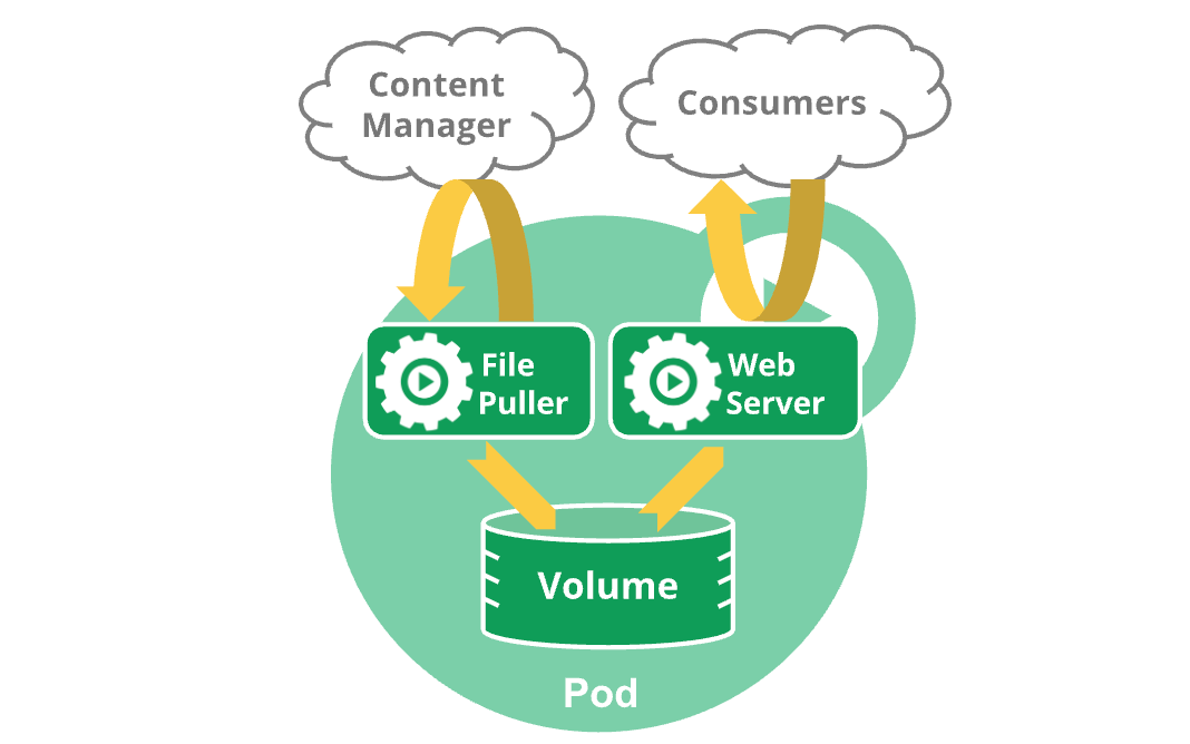 如下你可能有一个容器,为共享卷中的文件提供 Web 服务器支持,以及一个单独的 (Sidercar) 容器负责从远端更新这些文件,如下图所示: